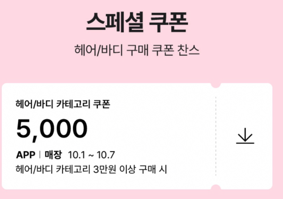 현재 10월 7일까지 헤어/바디 카테고리 전용 5천원 할인 쿠폰이 제공됩니다. 3만원 이상 구매 시 사용 가능하며, 앱과 매장에서 모두 적용됩니다.